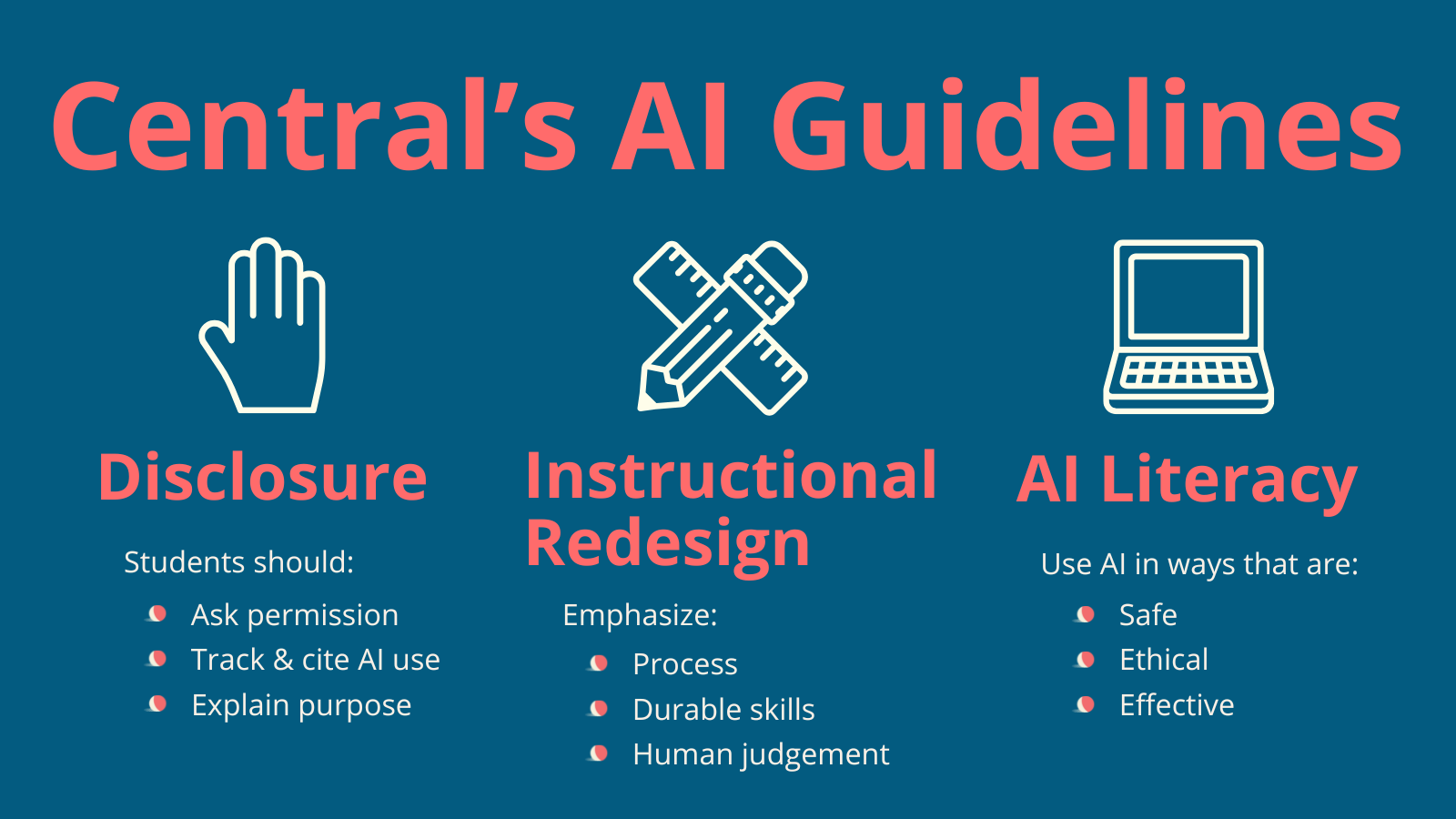 The guidelines went beyond compliance and academic integrity; they provided a map of Central's future and a clear signal that Central was dedicated to collaboratively shaping the impact of AI for their community.5